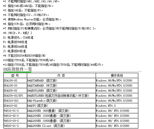 | *1 不能同時指定/AR1、/AR2和/A3。 *2 指定/AR1或/AR2后,不能指定/R1。 *3 指定/A3后,不能指定/F1。 *4 不能同時指定/C2、/C3和/CF1。 *5 使用Modbus Master功能,必須指定/M1。 *6 指定/CF1后,必須同時指定/M1。 *7 同時指定/P1和便攜式時,必須指定/H5不能同時指定/P1和/H5[ ]。 *8 /H5[D、F、R或J ] D:電源線UL、CSA標準 F:電源線VDE標準 R:電源線SAA標準 J:電源線BS標準 *9 不能對DX102和DX104指定/N2 *10指定/TPS2后,不能指定/TPS4,/AR2或/A3。 *11指定/TPS4后,不能指定/TPS2,/AR2,/A3或/F1。 |