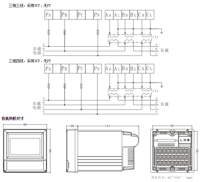 顯示三相電流、三相電壓、三相有功功率、三相無功功率、三相視在功率、功率因素、頻率、累積電能等電量參數(shù)。