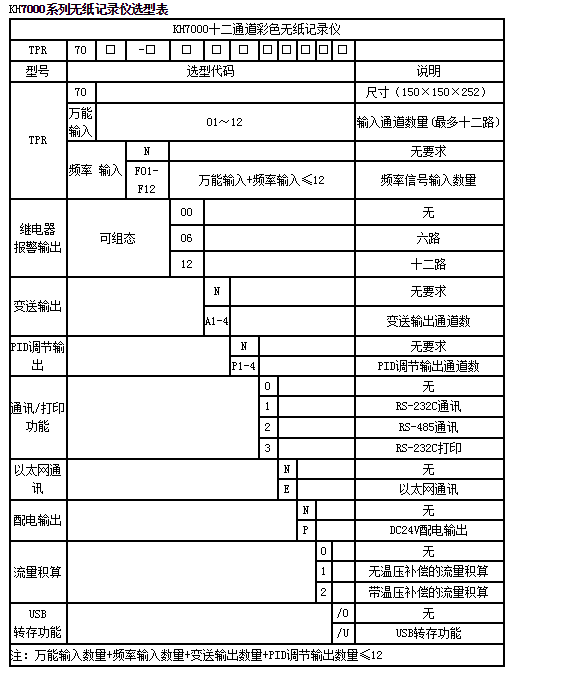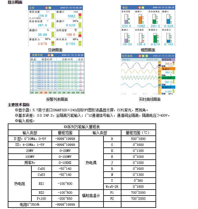 KH7000系列12路萬能輸入彩屏無紙記錄儀,可輸入標(biāo)準(zhǔn)電流、標(biāo)準(zhǔn)電壓、頻率、毫伏、熱電偶、熱電阻等信號。具有傳感器隔離配電輸出、繼電器報警輸出、變送輸出、流量積算、溫壓補償、歷史數(shù)據(jù)轉(zhuǎn)存、打印以及遠程通訊功能。