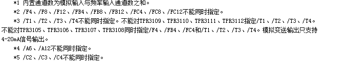 | ●報警輸出繼電器(/A6,/A12): 輸出點數(shù):從6、12點中選擇。 ●通信功能(/C2,/C3) 媒體:RS-232(/C2)或RS-485(/C3) 協(xié)議:Modbus-RTU(從機)協(xié)議 通信速率:1200/2400/4800/9600/19200/38400/57600 ●打印功能(/C4) 打印機:面板式微型打印機(僅支持McuP系列打印機)。 打印內容:實時數(shù)據(jù)、歷史數(shù)據(jù)、累積報表。 打印方式:手工打印、定時打印。 ●模擬輸出(/T1,/T2,/T3,/T4) 信號類型:4-20mA 輸出點數(shù):從1~4點中選擇。 輸出方式:測量通道的變送輸出。 最大負載:750Ω ●24VDC變送器電源輸出(TP4): 輸出電壓:24VDC。 額定輸出電流:4~20MADC。 最大輸出電流:65mAdc(過電流保護動作電流:約90mA) |