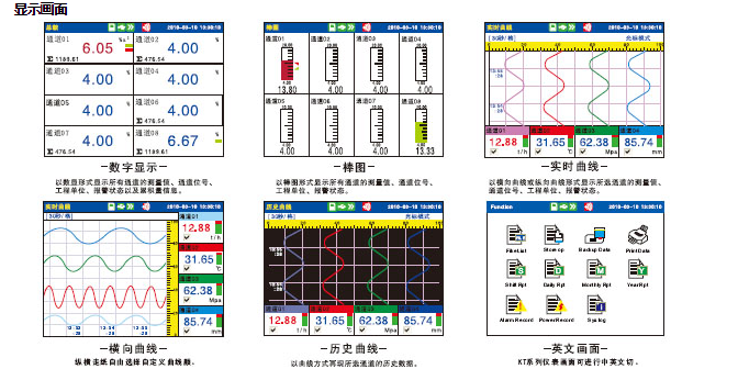 測(cè)量數(shù)據(jù)顯示(總覽、數(shù)宇顯示、V圖顯示、曲錢顯示〗,歷史曲線顯示,信息顯示(報(bào)替信息、累積報(bào)表),功能畫(huà)面(數(shù)據(jù)備份、打?。?/p>
