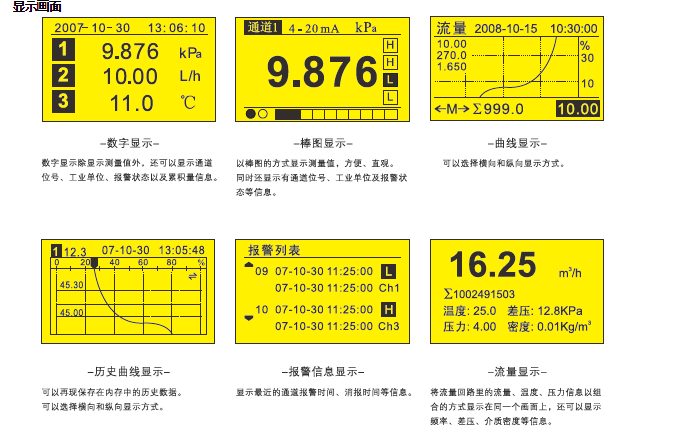 顯 示:發(fā)生報(bào)警時(shí),測(cè)量數(shù)據(jù)顯示畫(huà)面都有報(bào)警狀態(tài)顯示。