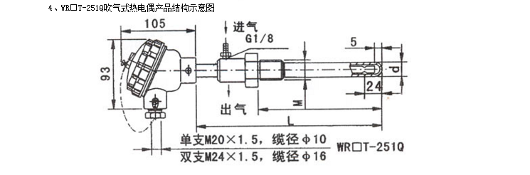 K分度號吹氣式熱電偶,M27×2螺紋安裝,熱電偶外徑為Ф16mm,熱電偶接線盒為大空腔接線盒,內(nèi)裝鎧裝熱電偶芯子,總長L*插深l=700*550mm