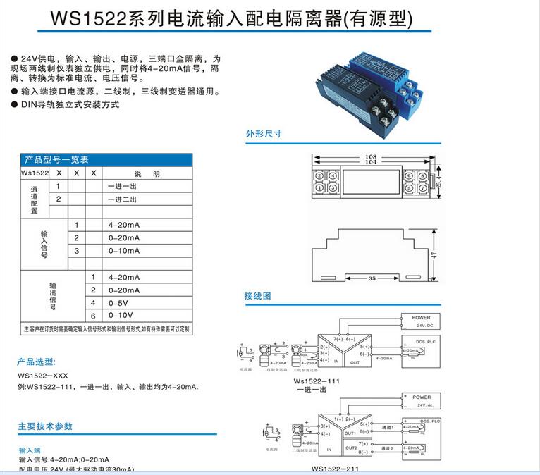 WS1522信號(hào)轉(zhuǎn)換模塊 輸出范圍:4-20mA、0-10V、0-20mA等用戶需要的標(biāo)準(zhǔn)信號(hào)