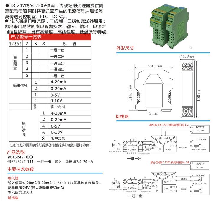 WS15242全隔離輸出信號(hào)分配器 安全隔離柵,信號(hào)隔離器模塊,安全柵,電流轉(zhuǎn)換模塊。將輸入信號(hào)變換為兩路相互隔離的信號(hào),低功耗,低熱量,低漂移,DIN T型導(dǎo)軌安裝