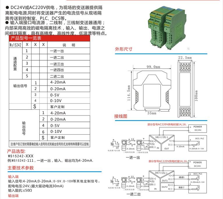 WS15242全隔離輸出信號(hào)分配器,配電器,安全隔離柵,信號(hào)隔離器模塊,安全柵,電流轉(zhuǎn)換模塊。將輸入信號(hào)變換為兩路相互隔離的信號(hào),低功耗,低漂移,DIN T型導(dǎo)軌安裝,默認(rèn)DC24V電源,AC220V.