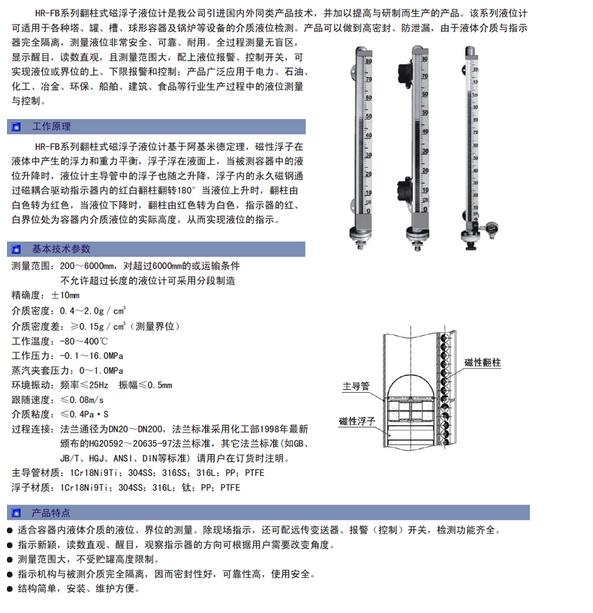 HR-FB系列翻柱式磁浮子液位計是我公司引進(jìn)國內(nèi)外同類產(chǎn)品技術(shù),并加以提高與研制而生產(chǎn)的產(chǎn)品。該系列液位計可適用于各種塔、罐、槽、球形容器及鍋爐等設(shè)備的介質(zhì)液位檢測。
