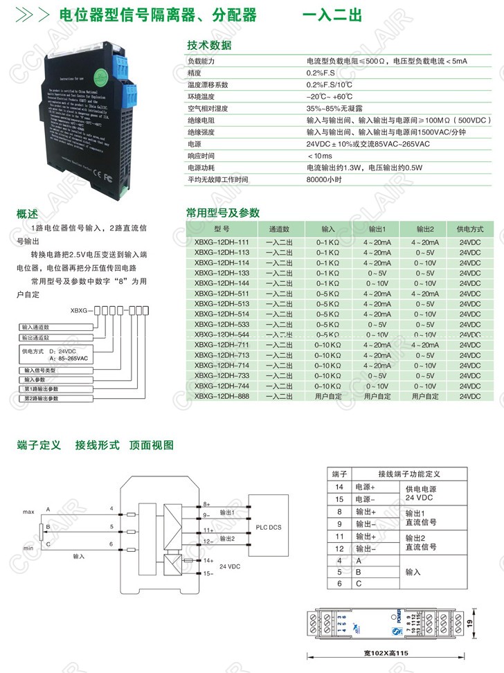 型號: XBXG-12DH,XBXG-12DH-714,XBXG-12DH-733,XBXG-12DH-744,XBXG-12DH-888,電位器型信號隔離器、分配器(一入二出)