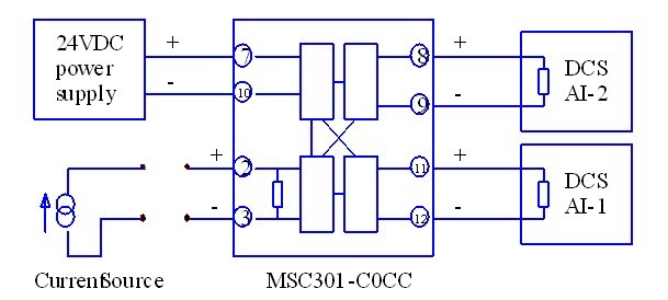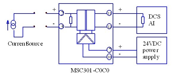 例1:輸入4~20mADC,輸出4~20mADC,一入一出,則型號(hào)為:MSC301-C0C0