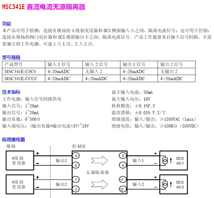 MSC341E,MSC341E-C0C0,MSC341E-CCCC,直流電流無源隔離器