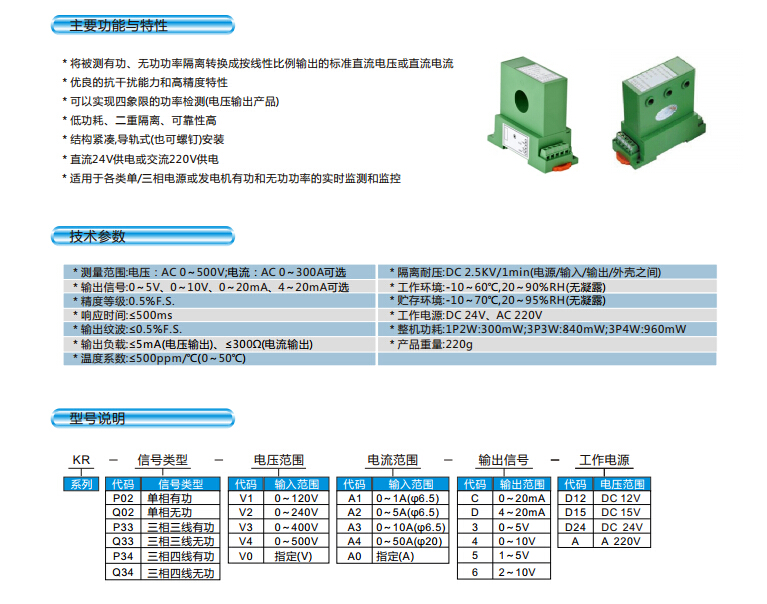 KR-PQ, KR-P02,KR-Q02,KR-P33,KR-Q33,KR-P34,KR-Q34功率隔離變送器