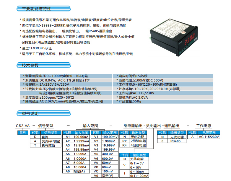 產(chǎn)品型號(hào):CS2-VA五位智能電流電壓表