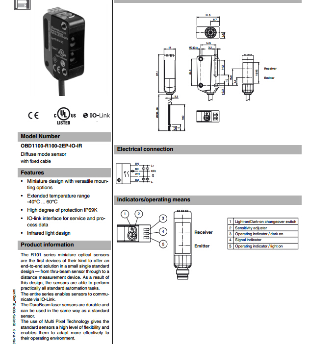 OBD1100-R100-2EP-IO-IR,漫反射型傳感