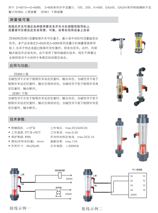 ZE950和ZE951流量極限開關(guān)可在最大、最小或中間任何流量值發(fā)出信號。本產(chǎn)品安裝在Z-5025至Z-5065系列流量計的測量管燕尾導(dǎo)軌 上,當(dāng)浮子到達(dá)或超過極限開關(guān)位置時,即發(fā)出信號。此時,內(nèi)部觸 點就會開啟或關(guān)閉。由于采用了新的磁感應(yīng)技術(shù),現(xiàn)在不再像過去 那樣將浮子分別用于單穩(wěn)態(tài)和雙穩(wěn)態(tài)場合。