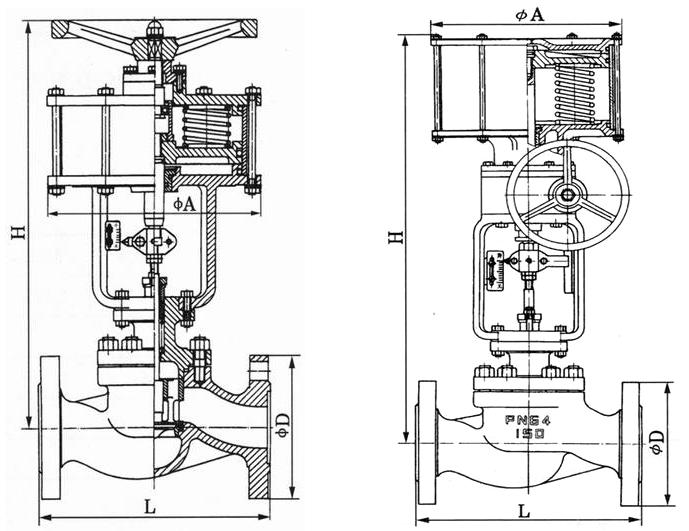 當(dāng)信號(hào)壓力通過(guò)管接頭輸入氣缸室在活塞上產(chǎn)生向下推力,使活塞產(chǎn)生位移并壓縮彈簧?;钊奈灰茙?dòng)推桿,閥桿和閥芯作相應(yīng)位移,至切斷達(dá)到額定行程值為止。按作用方式的不同可分為氣關(guān)式和氣開(kāi)式兩種,當(dāng)信號(hào)壓力增大推桿向下移動(dòng),使閥芯和閥座接合的為氣關(guān)式;反之使閥芯與閥座離開(kāi)式,則該閥型為反作用(氣開(kāi)式執(zhí)行機(jī)構(gòu))。