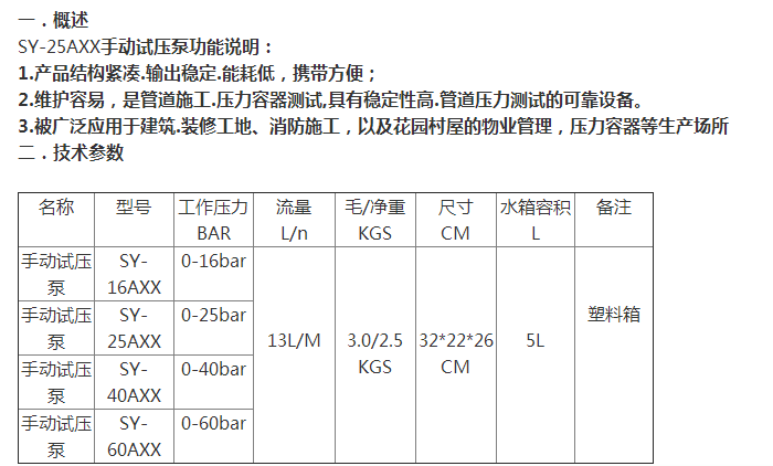 SY-16AXX,SY-25AXX,SY-40AXX,SY-60AXX,液壓手動試壓泵