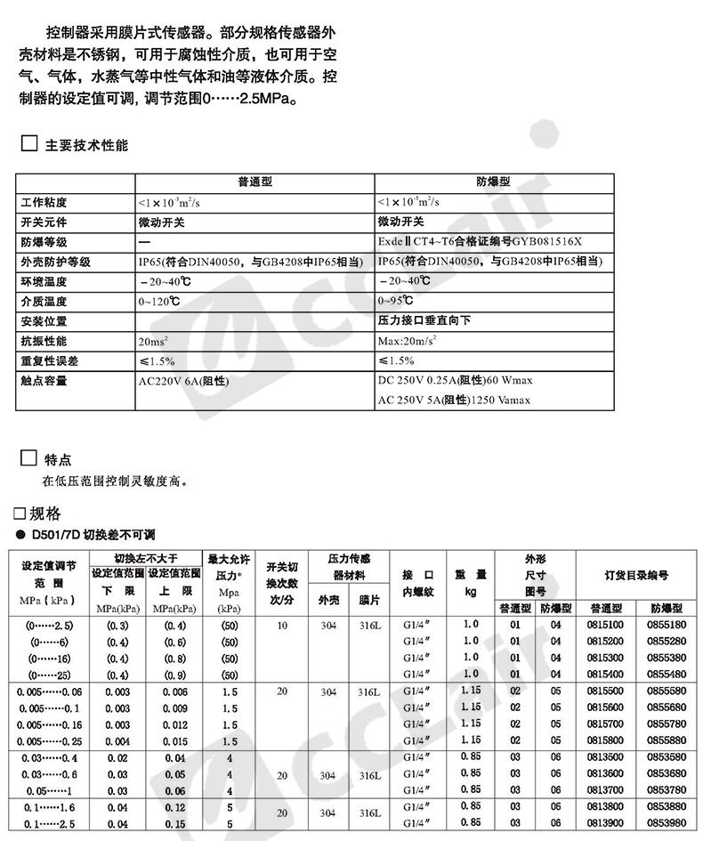 型號: 壓力控制器 防爆 D501/7D切換差不可調(diào)