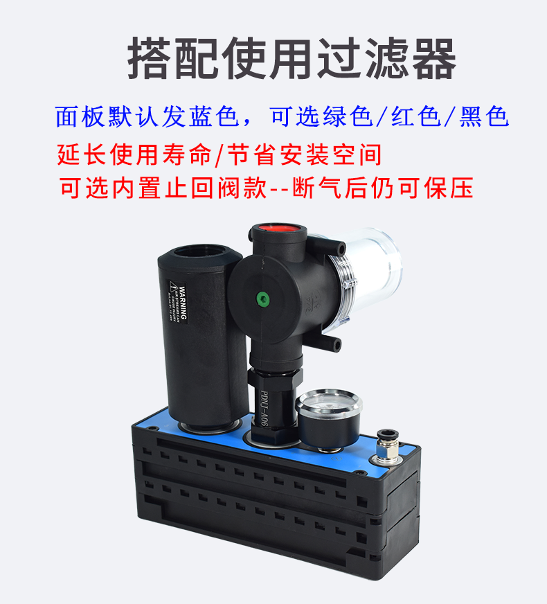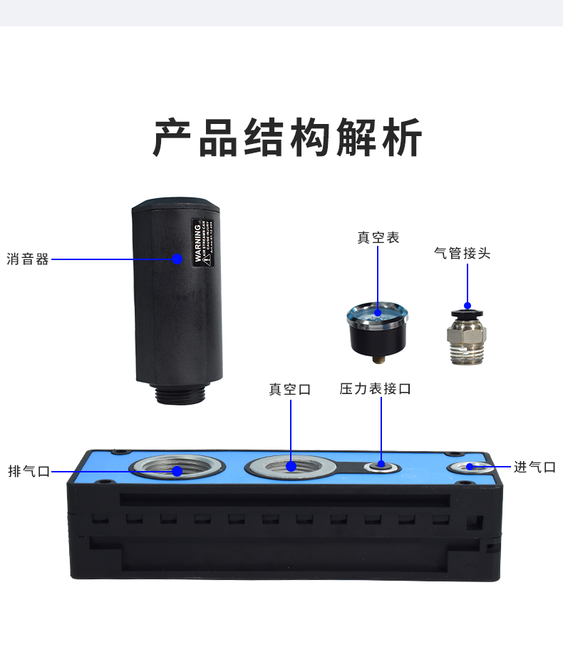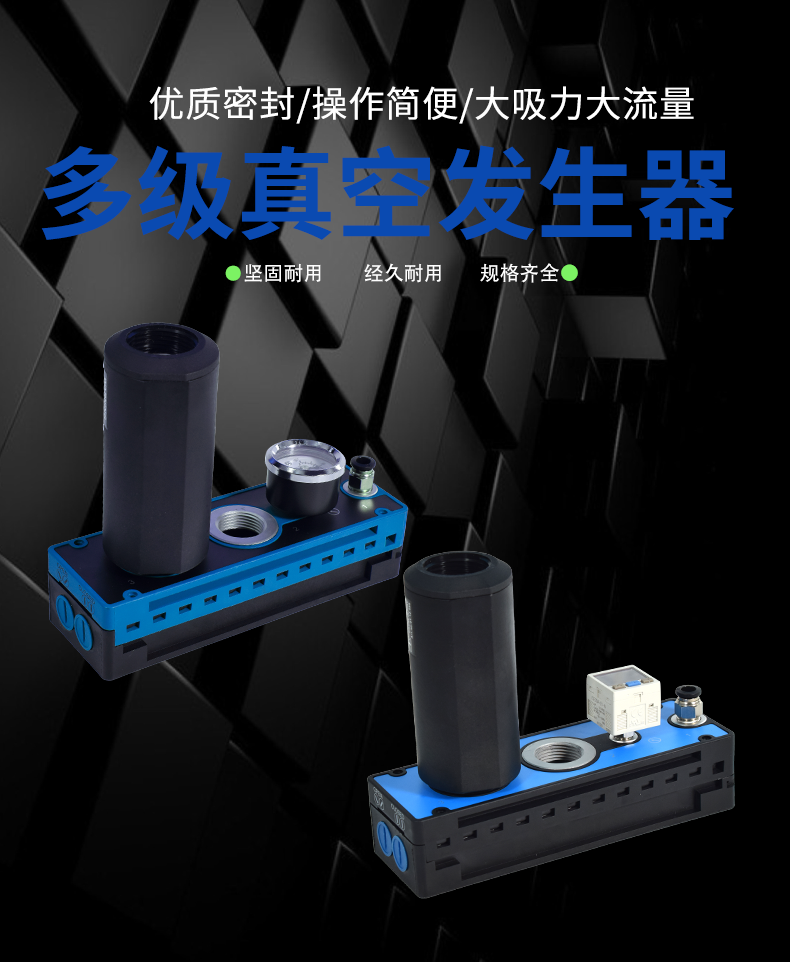 多級高真空型發(fā)生器的工作原理是利用噴管高速噴射壓縮空氣,?在噴管出口形成射流,?產生卷吸流動。?這種工作原理使得噴管出口周圍的空氣不斷地被抽吸走,?從而使吸附腔內的壓力降至大氣壓以下,?形成一定真空度。