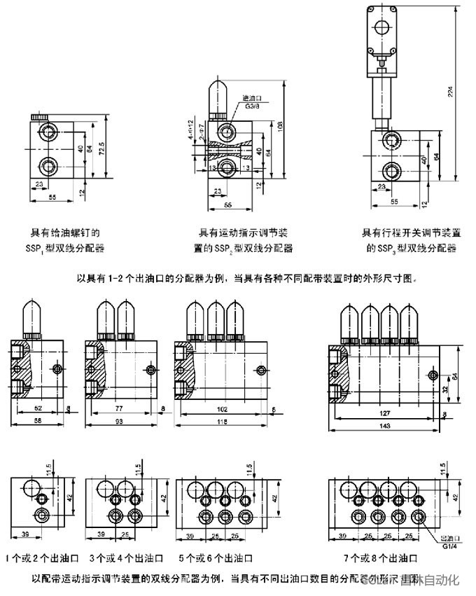 2、帶有行程開關(guān)調(diào)節(jié)裝置的分配器(SSPQ3型),每塊只帶一件限位開關(guān)調(diào)節(jié)裝置,如有特殊需要,每對(duì)出油口都可配帶,須注明配帶數(shù)量,單獨(dú)訂貨。