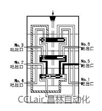 5、流入的潤滑劑推動(dòng)活塞C向右移動(dòng)、右腔的潤滑劑壓向NO.4吐出口經(jīng)外部配管送向潤滑點(diǎn)。當(dāng)活塞C運(yùn)動(dòng)至右極限時(shí)活塞B左腔開始進(jìn)入潤滑劑。