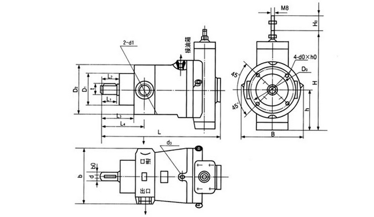 表示:排量為63毫升/轉(zhuǎn),壓力為31.5MPa的手動(dòng)變量的缸體旋轉(zhuǎn)的軸向柱塞油泵。