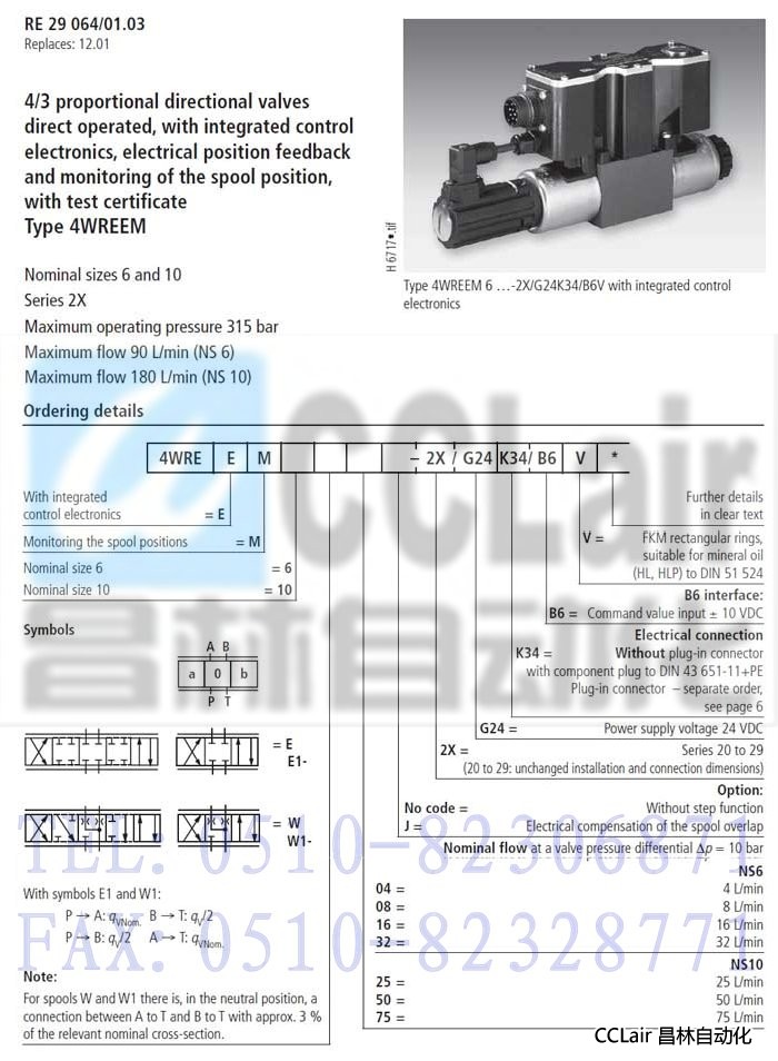 4WREEM6W16-2X/G24K34/B6V,4WREEM6E32-2X/G24K34/B6V,,比例方向閥,力士樂REXROTH,德國力士樂 |