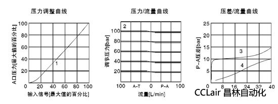 注:1=流量在10L/min時測得的壓力調(diào)整曲線;2=流量在10L/min時輸入信號變化的壓力流量曲線;