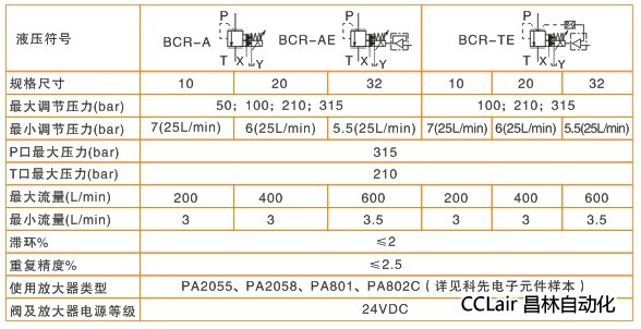 BCR是錐閥型先導(dǎo)式比例溢流閥,閥的壓力與輸入電信號(hào)成正比。此類閥工作時(shí)是通過電子放大器提供比例電磁鐵的驅(qū)動(dòng)電流,調(diào)整閥的工作壓力。