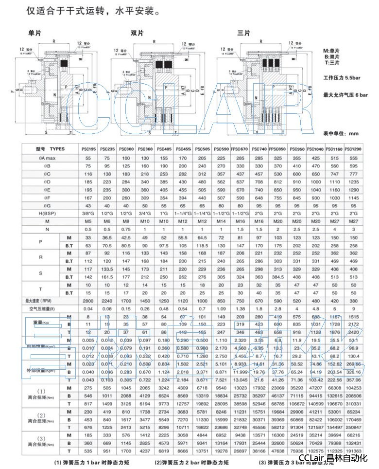 PSC195,PSC235,PSC300,PSC360,PSC405,PSC455,空壓多片式離合器