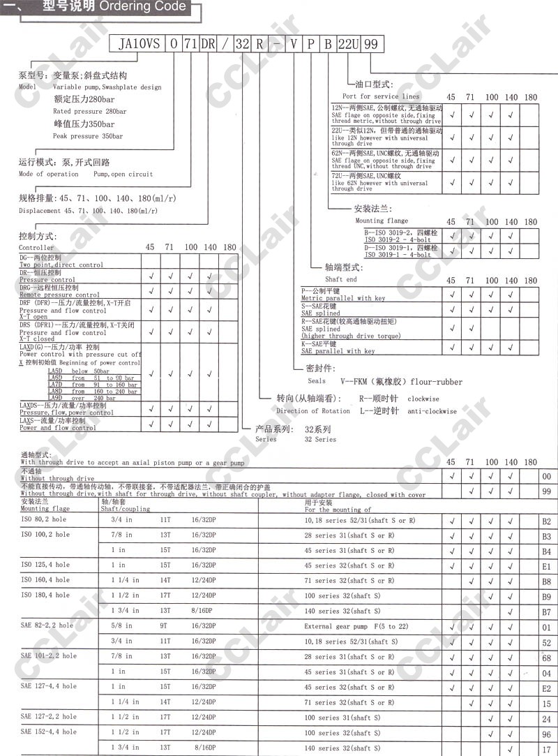 JA10VS045DR/32R,JA10VS071DR/32L,JA10VS0100DRF/32R,JA10VS0140DR/32R,JA10VS0180DRG/32L,變量柱塞泵