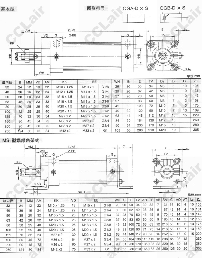 QGA-32,QGA-40,QGA-50,QGA-63,QGA-80,QGA-100,QGA-125,QGA-160,QGA-200,QGA-250,雙作用普通氣缸