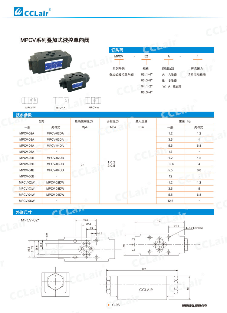疊加式液控單向閥MPCV-02A,MPCV-03A,MPCV-04A,MPCV-06A,MPCV-02B,MPCV-03B,MPCV-02W,MPCV-03W,MPCV-04B,MPCV-04W,MPCV-06B,MPCV-06W,保壓閥