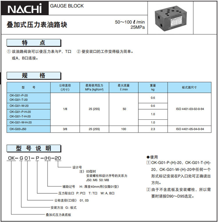 OK-G01-P-20,OK-G01-T-20,OK-G01-W-20,OK-G03-J50,OK-G01-W-H-20,NACHI疊加式壓力表油路塊