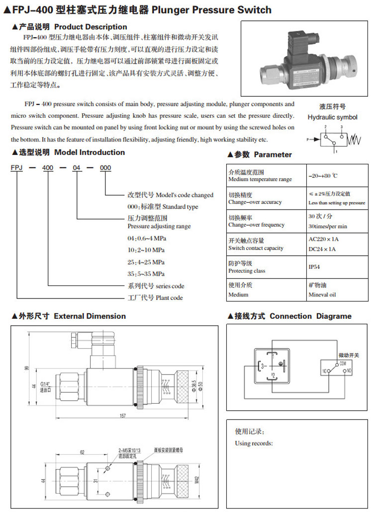 FPJ-400-04,FPJ-400-10,FPJ-400-25,FPJ-400-35,柱塞式壓力繼電器