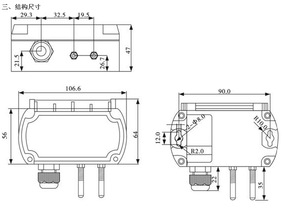 一、概述 KH-804型壓力變送器由進(jìn)口微小量程,高穩(wěn)定性能傳感器和高可靠性信號(hào)處理IC電路構(gòu)成,有更好的抗干電磁干擾和浪涌電流能力。 二、技術(shù)指標(biāo) l 量程范圍:0-100Pa~100KPa; -100~0KPa l 測(cè)壓形式:表壓(G)、負(fù)壓(N)、差壓(C) l 補(bǔ)償溫度:-10~70℃ 工作溫度:-20~85℃ l 綜合精度:0.1%、0.25%、0.5%、1% l 輸出選擇:4~20mA、0~10mA、1~5V、0~5VDC l 電源電壓:15VDC、24VDC l 測(cè)量介質(zhì):無腐蝕性氣體