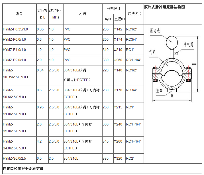 1、 膜片式脈沖阻尼器的容積、材質、連接方式(或提供泵的流量、壓力、介質、材質,由我公司為您提供精確選型)