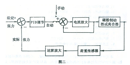 在放卷端采用變頻器控制時(shí),當(dāng)實(shí)際張力大于設(shè)定張力,張力控制儀的電壓減小,阻尼減小,使物料張力返回到設(shè)定值。當(dāng)實(shí)際張力小于設(shè)定張 力時(shí),張力控制儀的電壓增大,阻尼也增大,使物料張力返回設(shè)定值。如此形成負(fù)反饋,使張力保持恒定。原理框圖如圖二。
