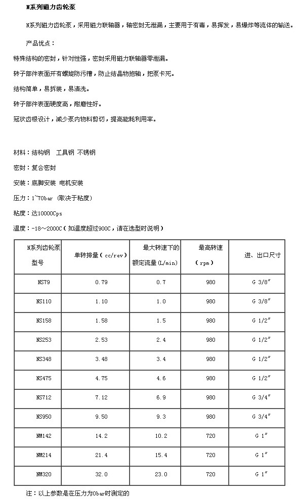 NS79,NS110,NS158,NS253,NS348,NS475,NS712,NS950,NM142,NM214,NM320,磁力齒輪泵