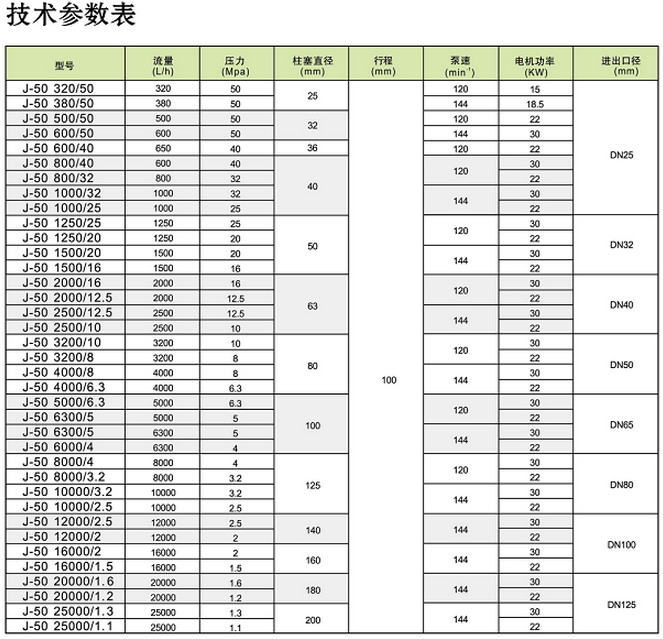 J-50-320/50,J-50-380/50,J-50-500/50,J-50-600/50,J-50-600/40,J-50-800/40,柱塞式計量泵