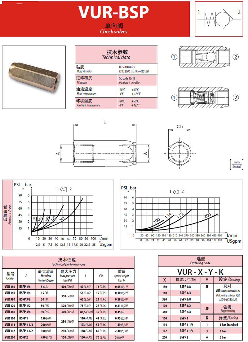 VUR180,VUR140,VUR380,VUR120,VUR340,VUR160,VUR114,VUR112,VUR200,單向閥