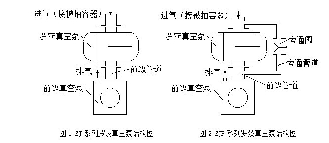 二、ZJ系列羅茨真空泵在較低入口壓力時(shí)具有較高的抽氣速率,但它不能單獨(dú)使用,必須有一臺(tái)前級(jí)真空泵串聯(lián),待被抽系統(tǒng)中的壓力被前級(jí)真空泵抽到羅茨真空泵允許的入口壓力時(shí),羅茨真空泵才開(kāi)始工作(見(jiàn)圖1)。