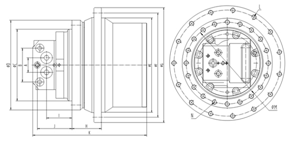 本產(chǎn)品為馬達(dá)與減速機(jī)一體的行走裝置。由集成于減速機(jī)內(nèi)部的雙排量軸向柱塞馬達(dá)、行走減速器組成。馬達(dá)內(nèi)置安全閥、防反轉(zhuǎn)閥、停車制動裝置及高低二檔轉(zhuǎn)換裝置,它的特點(diǎn)是:傳動比范圍大、結(jié)構(gòu)緊湊、工作效率高、可靠性強(qiáng)、體積小、運(yùn)動平穩(wěn)、噪音低等,同時具有多級安全保護(hù)、使用壽命長等優(yōu)點(diǎn)。適用于液壓履帶驅(qū)動行走裝置