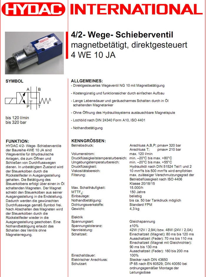 4WE10JAS01-12DG/V,4WE10JAS01-24DG/V,HYDAC電磁4/2方向滑閥