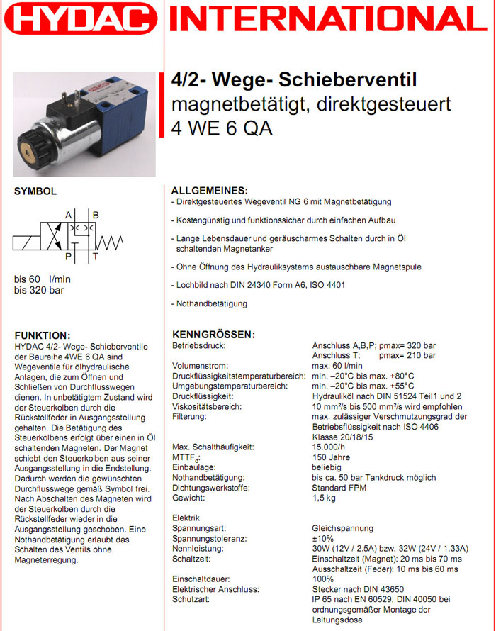 4WE6QAS01-12DG/V,4WE6QAS01-24DG/V,HYDAC電磁4/2方向滑閥