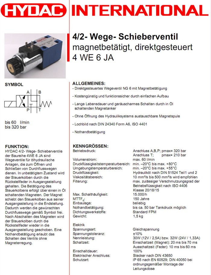 4WE6JAS01-12DG/V,4WE6JAS01-24DG/V,HYDAC電磁4/2方向滑閥