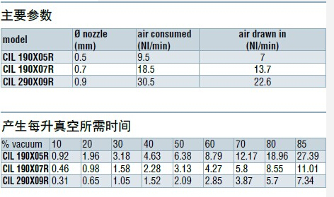 詳細信息 CIL190X05R,CIL190X07R,CIL290X09R,COVAL直線真空發(fā)生器 CIL系列有3種噴嘴直徑可供選擇(0.5,0.7和0.9mm),真空等級最高達90%。 主要參數(shù)見下表: