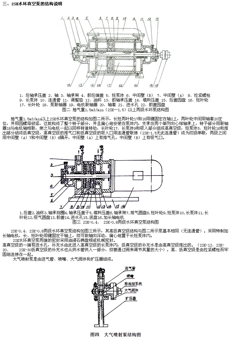 機組是由2SK水環(huán)真空泵和一級大氣噴射泵組成,用戶根據(jù)需要可單獨使用兩級水環(huán)真空泵。