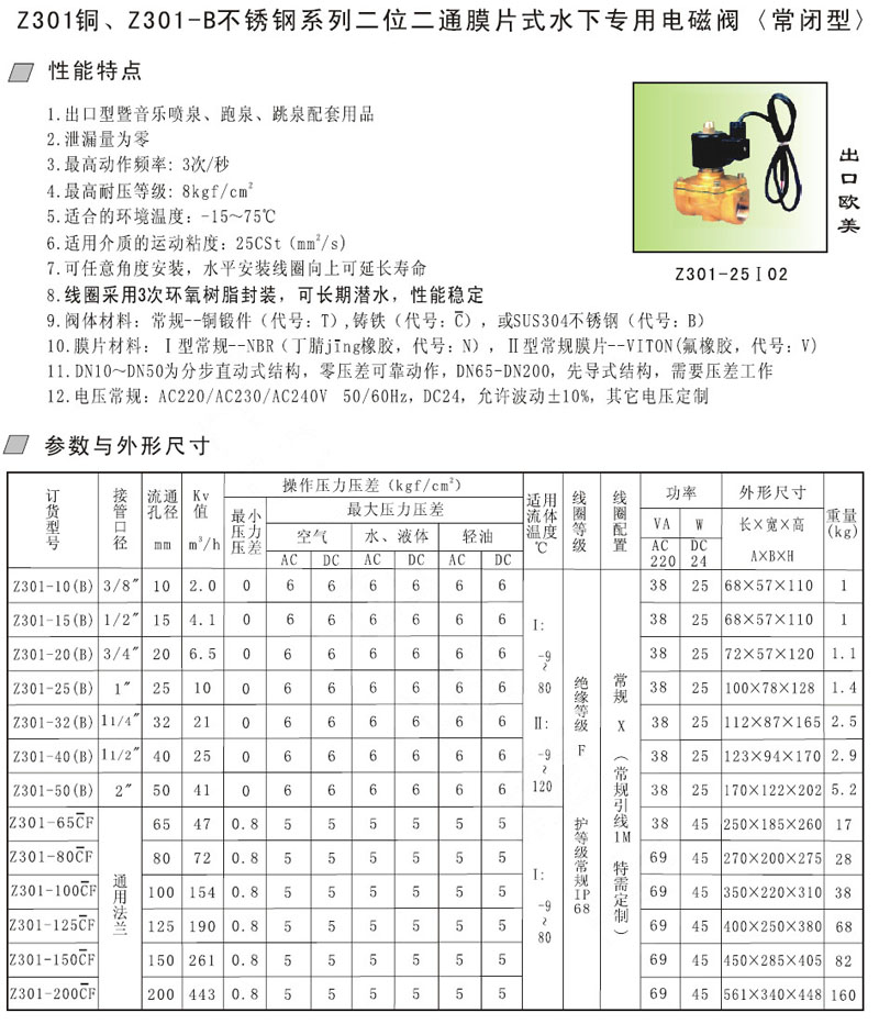 Z301-10,Z301-15,Z301-20,Z301-25,Z301-32,Z301-40,Z301-50,水下專用電磁閥