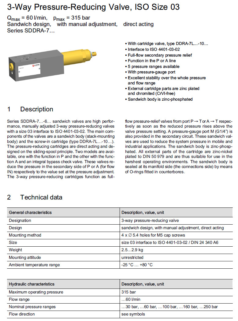 詳細信息 SDDRA-7L-P-6-25,SDDRA-7L-P-6-16,SDDRA-7L-P-6-06,SDDRA-7L-P-6-10,Bucher減壓閥