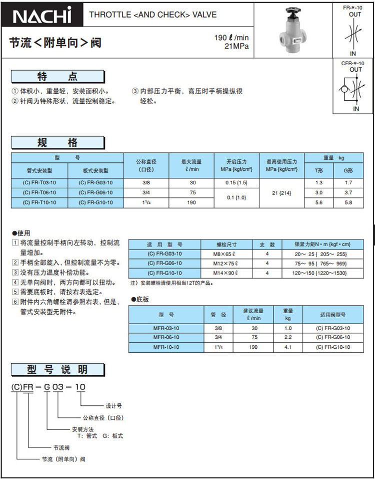 FR-T03-10,FR-T06-10,FR-T10-10,FR-G03-10,FR-G06-10,FR-G10-10,NACHI節(jié)流閥